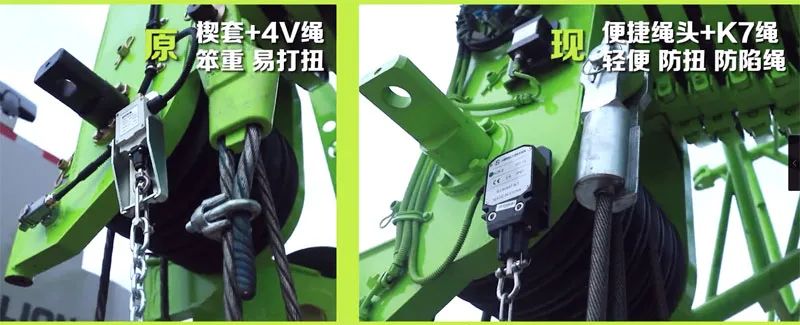该产品特别优化了吊钩换倍率结构装置的便利性,将原来笨重、易打扭的楔套+4V绳索,改为轻便、防扭、防陷绳的行业独有便捷绳头+K7绳索,使得设备作业效率更高,也更安全。