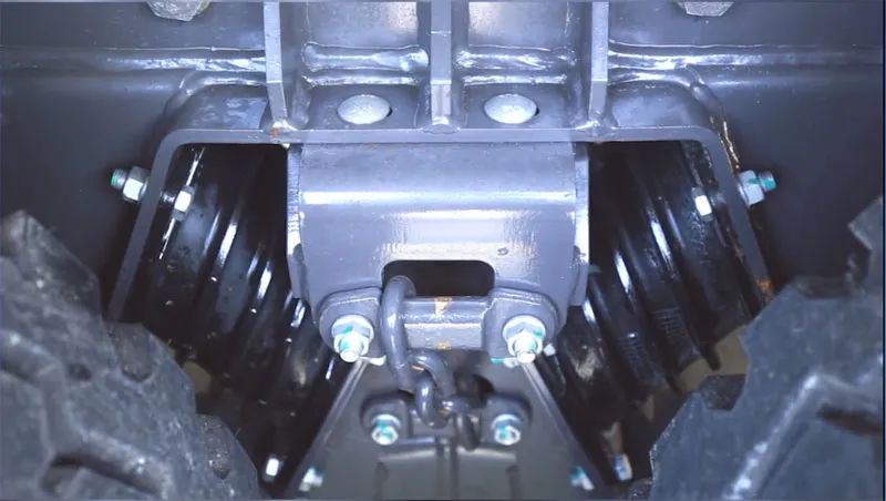 悬架系统是起重机底盘主要系统之一,这款产品的前桥采用纵置钢板弹簧悬架,后桥悬架采用橡胶簧+V型推力杆结构,相比传统的板簧悬架可有效改善车辆的行驶平顺性、提高车辆的操纵稳定性,从而更好地保证行驶安全。