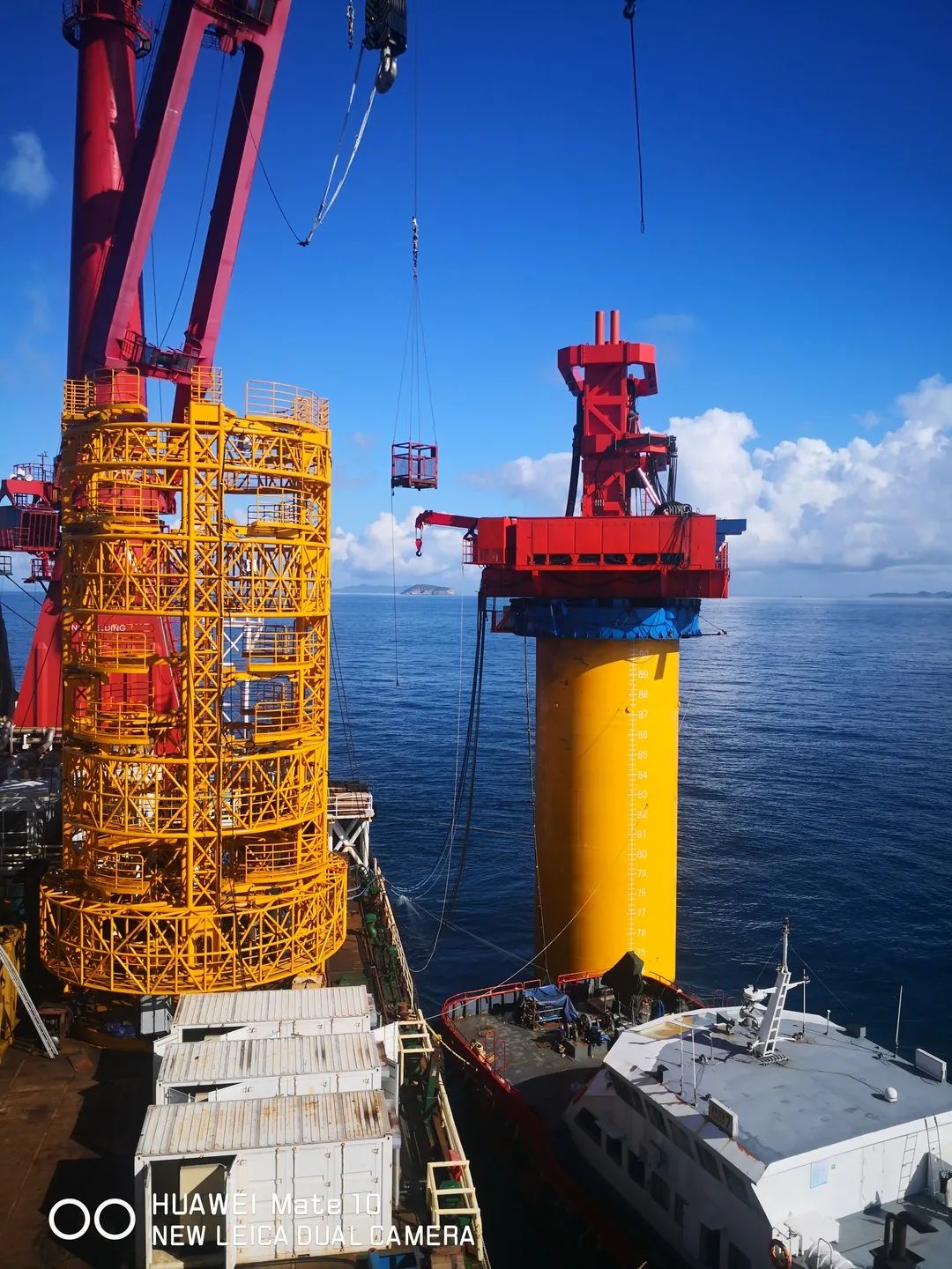 该项目共计32个机位,其中非嵌岩机位29个,嵌岩机位3个,平均每根桩重1500吨,桩径达7.5米至8.7米。