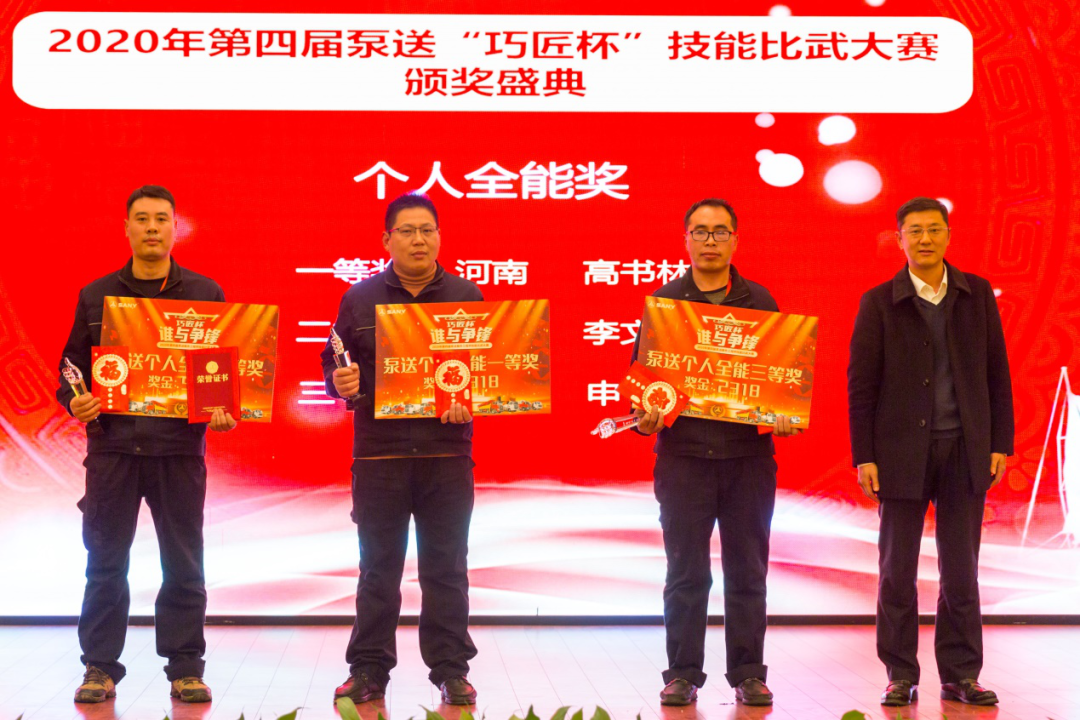 在颁奖典礼上,泵送服务支持部部长聂豫湘先生作为大赛裁判长,就本次大赛的赛题设计基本思路与比赛过程做了详细的总结和点评。他指出,本次技能比武大赛整体来看喜大于忧,虽然时间紧,天气寒冷,但参赛选手热情高涨,充分展现了竞赛风采,理论成绩相比去年高出很多,另外在搅拌主机轴端密封更换这个项目中,记录被反复打破,起初湖北谭亮选手以28分50秒的成绩打破记录,接着河南赵亚辉又以27分81秒的成绩再创新高,最终江苏李文明选手以26分03秒的成绩拿下此项第一。