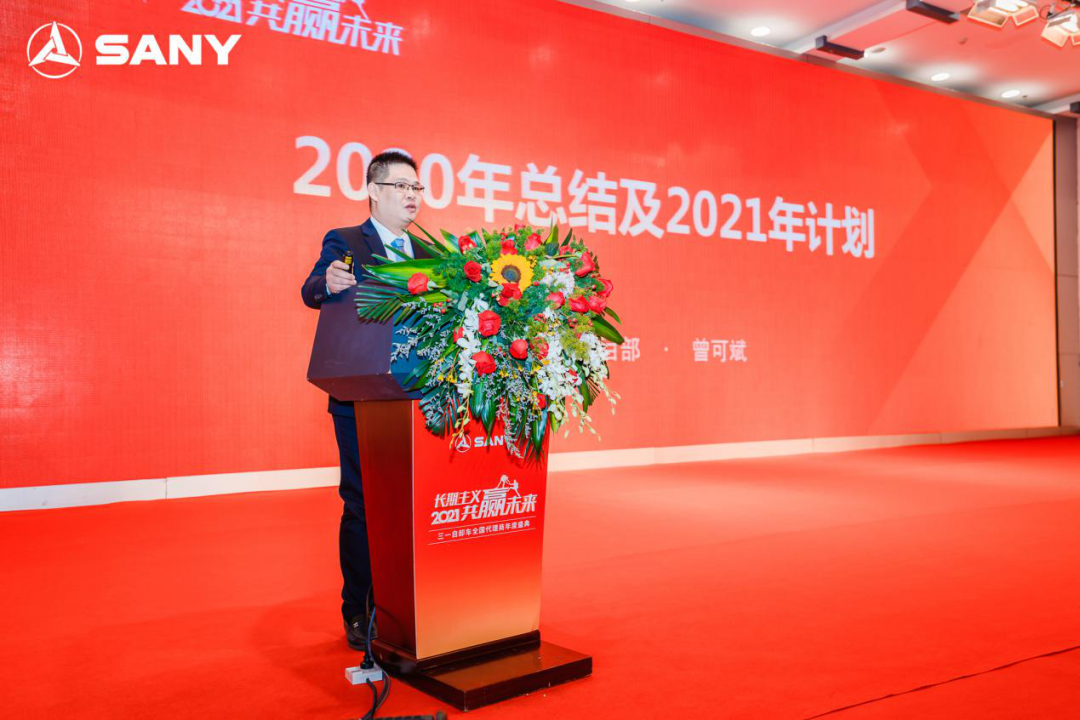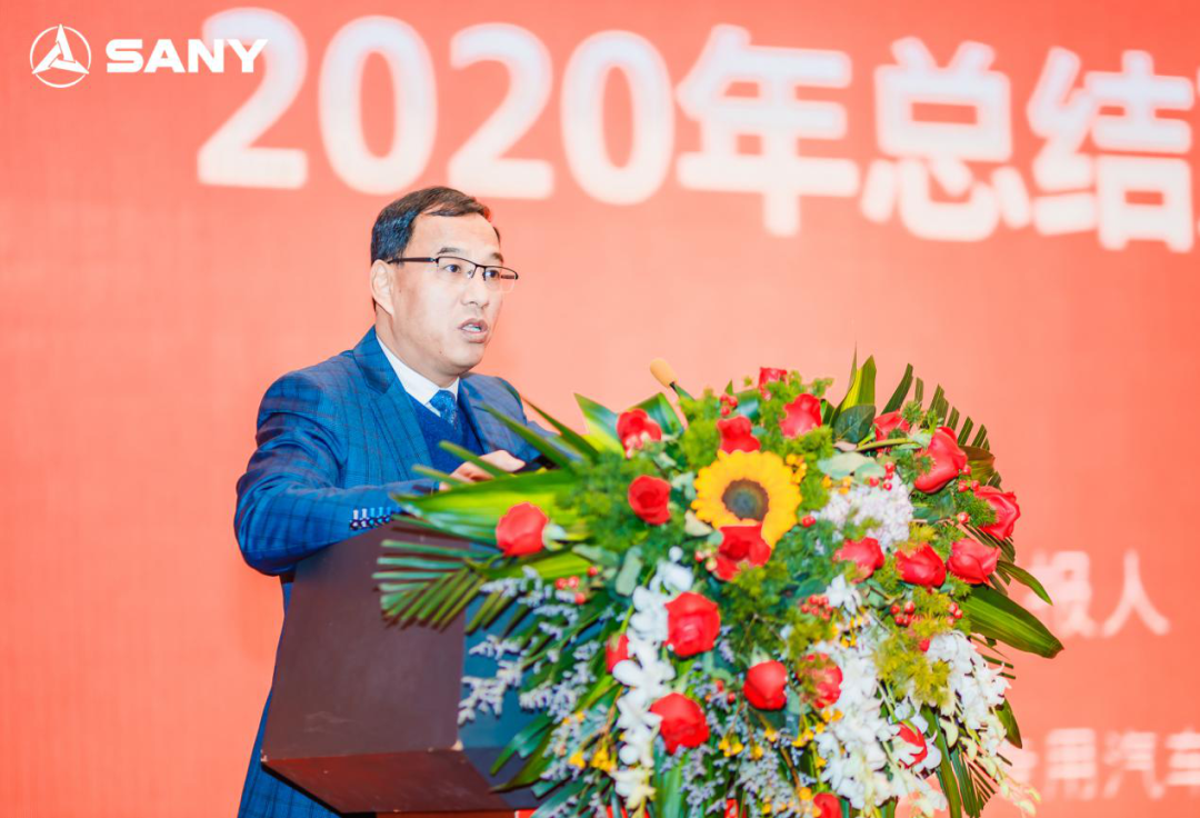 三一自卸车项目部部长曾可斌先生对自卸车年度工作做了总结与展望。从宏观经济环境、行业趋势、法规变化等多个维度进行了解读与回顾,并汇报了三一自卸车2020年在销售任务、代理商网络开发、产品开发、售后服务等方面取得的进展。最后曾可斌先生重点围绕2021年8000台的销售目标,分别从代理商网络开发、产品、金融、服务配件、客源支持、人才培养等各方面提出了整体工作部署。随后,三一自卸车项目部副部长盖贤正先生、服务部经理陆兴凌先生、市场部经理漆靖先生、三湘银行张巧先生分别就2021年自卸车销售作业思路和要求、服务政策、产品规划、金融支持等方面进行了详细的介绍。