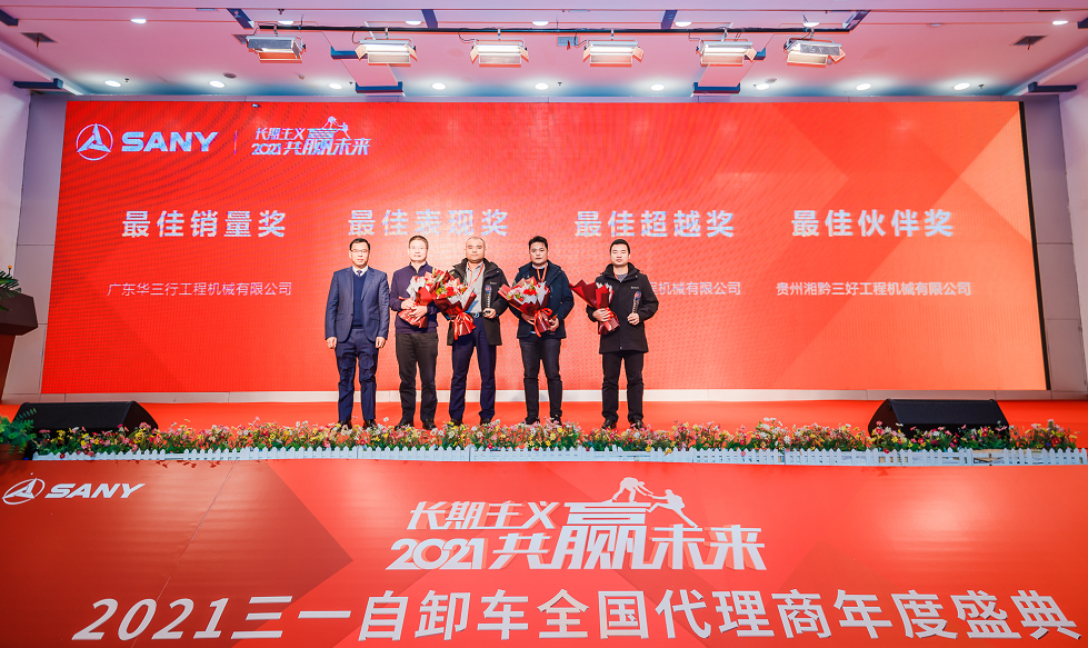 在2020年优秀代理商表彰环节,四家表现优异的代理商:广东华三行工程机械有限公司、无锡兄弟联盟工程机械有限公司、湖南能旭工程机械有限公司、贵州湘黔三好工程机械有限公司分别荣获“最佳销量奖”、“最佳表现奖”、“最佳超越奖”、“最佳伙伴奖”。