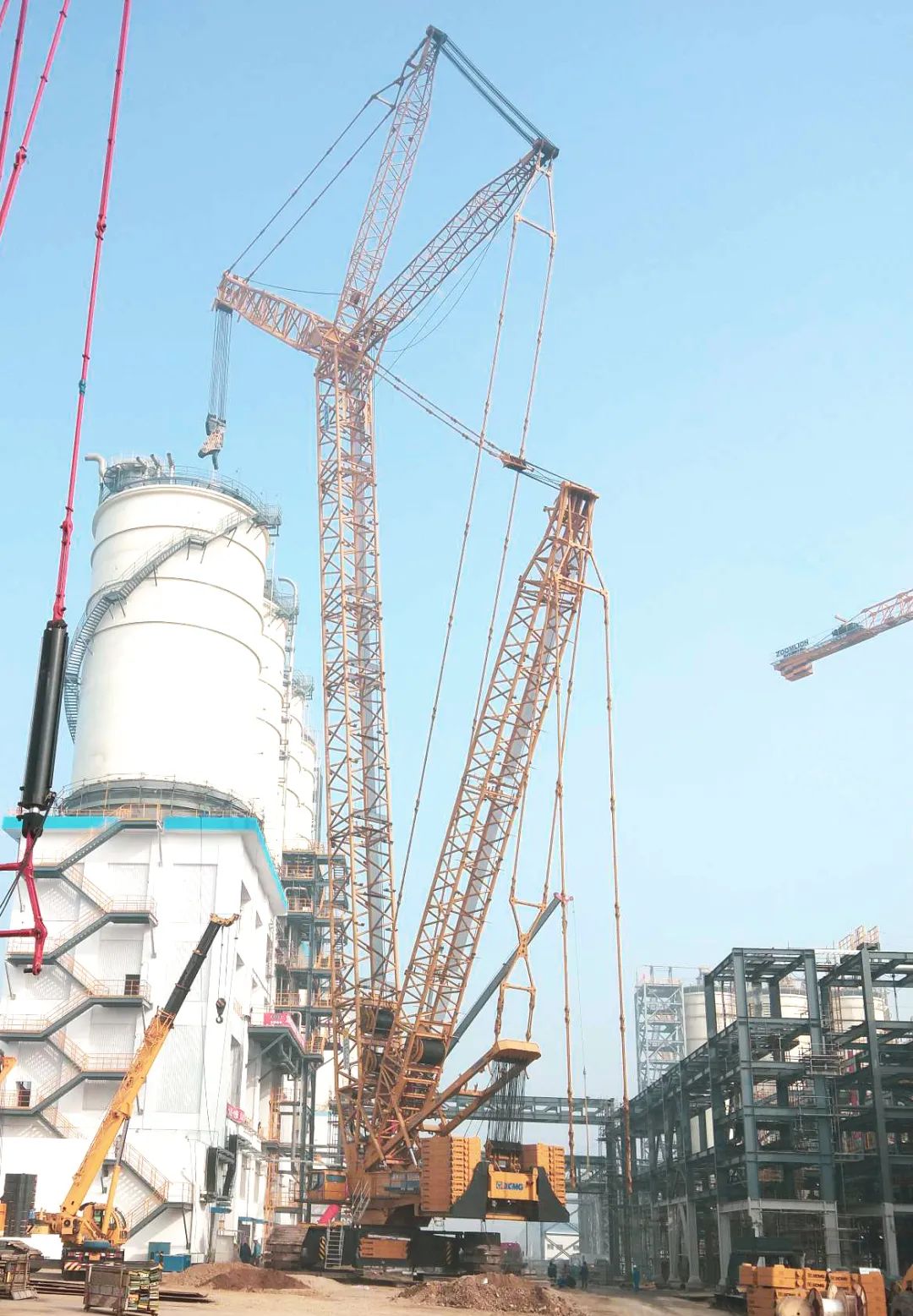 项目现场,徐工XGC88000三号车作为主吊车,采用102+33米超起专用副臂工况,在千吨级溜尾递送吊车协同配合下,“擎天巨擘”平稳启动、吊重、上升、变幅、回转、就位,成功将直径9.8米、高74米、重1600吨的常压塔吊装就位,整个过程无可挑剔,用时不到两小时。
