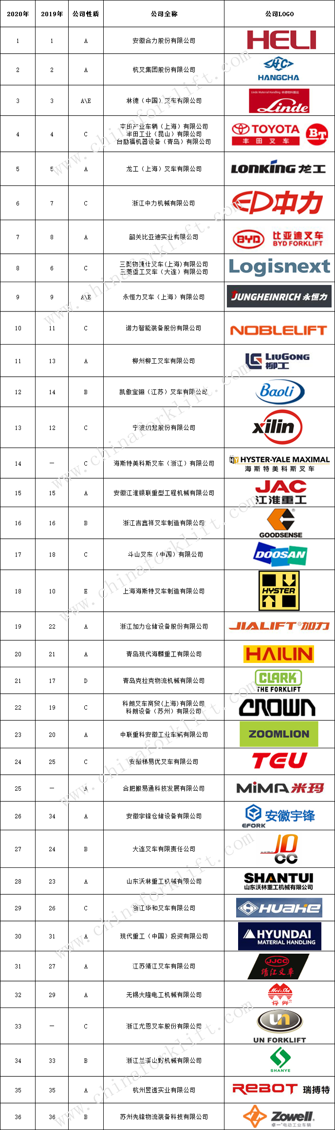 前三十名的制造商中,林德、丰田(包括台励福)、三菱物捷仕、永恒力、凯傲宝骊、海斯特(包括美科斯)、斗山、科朗、现代、克拉克是活跃在中国市场的前10位外资叉车制造商。