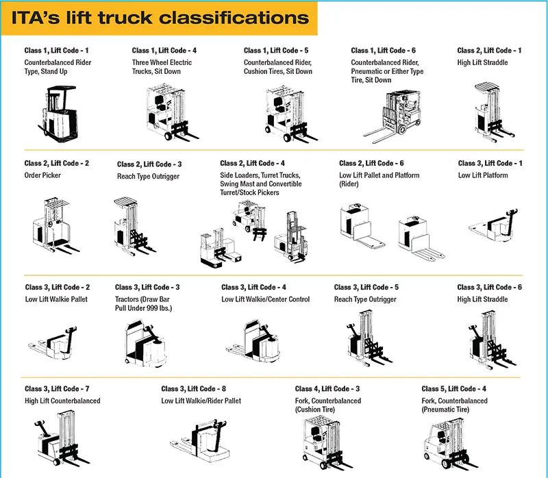 工业卡车协会(ITA,indtrk.org) 定义了七类叉车,它们是由发动机类型、工作环境、操作员位置和设备特性定义的。