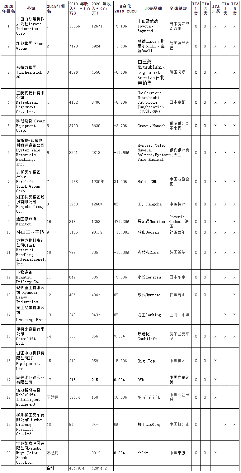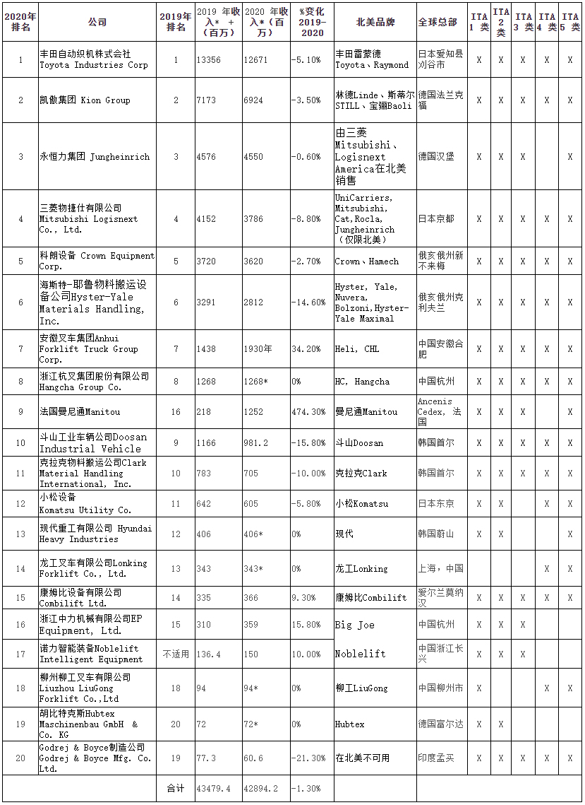 排名基于每家公司最近一个财年的叉车的全球收入。以外币提交的收入数据是使用2020年12月31日的汇率计算的。由于货币转换问题和时间问题,某些供应商的百分比变化可能与年度报告或其他来源中的数字或百分比有所不同。