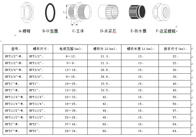 2、产品材质: A.C.F部位采用黄铜镀镍,D部位采用UL认可的尼龙PA66,B.E部位采用丁腈橡胶。