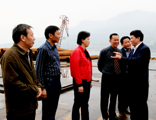 集团公司董事长谭安乐(中)在鞍子坝客运港区向康莲英主席(左)介绍情况