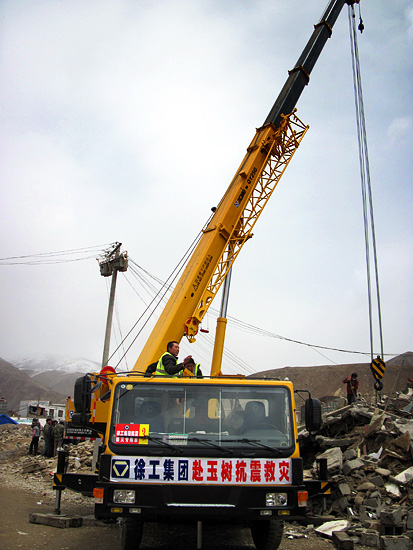 自4月14日晚出发至4月30日撤出的16个日夜,无论多苦多累、高原反应多强,徐工救援队一直咬牙战斗,不下火线。4月19日晚,队员在两天两夜没休息的情况下,继续在玉树机场完成受损电力设备吊装,帮助机场恢复电源供应,为玉树“生命线”提供了最可靠的基础保障。23日赶到中央领导现场视察过的孤儿院施工,队员们冒着生命危险,从坍塌的房子上吊下水箱,为孤儿院排除了危险。25日晚队员以精湛的吊装技艺,连夜吊运、调整济南军区野战方舱医院格局,让医院功能得到充分发挥,保证了灾区群众就诊。救援队在灾区不停地转战结古镇镇中心、跑马场、体育场等多处受灾现场,吊楼板、清废墟,帮助灾民抢救出大量粮食、衣物和用品。玉树群众对徐工救援队给予了很高评价,当地藏民以不同方式向徐工队员表示感谢,很多群众感动得流下热泪。4月20日中央电视台直播大型赈灾晚会上,徐工集团向玉树灾区捐款600万元。