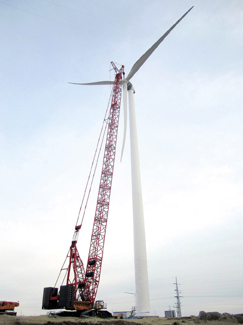 河北张北坝上草原位于内蒙古高原南缘,这里建设了国家能源大型风电并网系统研发(实验)中心——张北风电试验基地。2011年11月24日,在张北风电试验基地,三一SCC5000WE风电专用履带起重机,采用102m+12m、工作角度10°、就位高度102m固定副臂(FJ)工况,圆满完成2兆瓦实验风机所有部件吊装(其中主机部分重76t、叶片重50t),赢得业主及客户内蒙古送变电有限责任公司的高度认可。