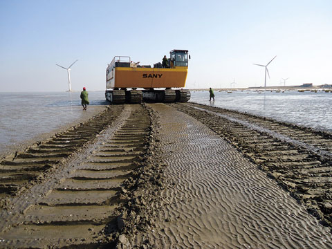 2011年12月4日,经过长途跋涉,SYTY90滩涂运输车从三一昆山产业园发至三峡新能源响水潮间带风电项目现场。经过近半个月的紧张工作,滩涂运输车进行了包括直线行走、爬坡及行走转向等试验,经过测试,各项性能指标均满足要求。