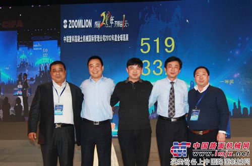 中联重科副总裁郭学红、中联重科副总裁、混凝土机械公司总经理陈晓非和获得一等奖的客户合影