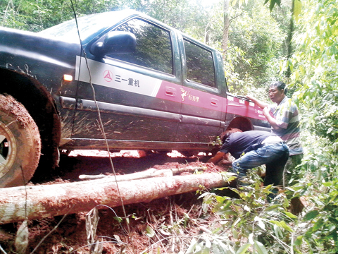 2012年6月16日,服务万里行巡检人员肖剑军前往云南思茅客户处巡检。路上,肖剑军遭遇瓢泼大雨。驶入深山后,因山路崎岖,车辆陷入泥坑,无法行驶。为了不耽误巡检,肖剑军跟附近村民借了背篓,背着配件赶路,一路披荆斩棘,抵达客户工地。圆满完成巡检任务后,敬业的肖剑军得到了客户及当地村民的热心相助,将服务车拖出了泥坑。