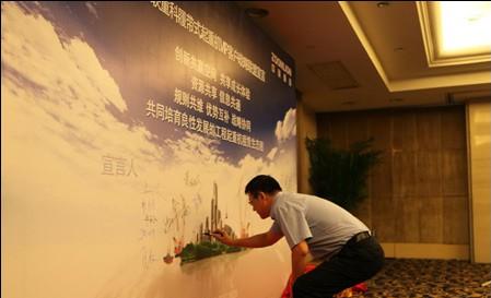 与会代表在签名墙上纷纷签名,图为中联工起公司总经理熊焰明正在签名。