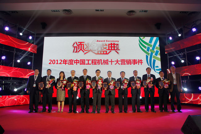 这是由《今日工程机械》杂志社主办、中国工程机械工业协会及其代理商工作委员会协办的中国工程机械第十届营销高峰论坛暨2012年中国工程机械代理商年会“ 2012年度中国工程机械十大营销事件”颁奖典礼现场。此次活动以引领行业营销进步、树立行业服务典范、促进行业持续健康发展为旨,组织近50家企业参与评选,公正权威。徐工以占据行业发展制高点为视野,围绕大吨位装载机强力实施差异化战略,以智能化与信息化加速传统工程机械制造业的转型升级,用实力冲破外资品牌的垄断,捍卫国产大吨位装载机的地位,在行业内产生巨大影响。