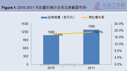 gongkong市场研究显示2011年,OEM市场跌宕起伏,接触器用量呈现“先扬后抑”态势,从全年用量来看,接触器在OEM行业应用规模为71.5亿元,其中应用规模最大的是起重机械行业,在OEM市场应用规模为12.9亿元,同比增长19.1%。