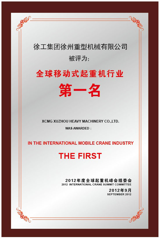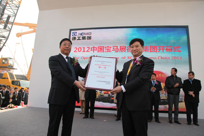 中国工程机械协会秘书长苏子孟为徐工颁发全球第一奖牌宝马展上,中国工程机械行业协会为徐工颁发全球移动式起重机第一证书