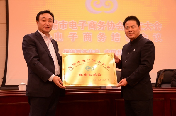 无锡市商务局王学芯局长颁发了理事长单位牌匾给无锡市电子商务协会第一届理事长蒋锡培先生,随后蒋锡培进行了大会致辞。