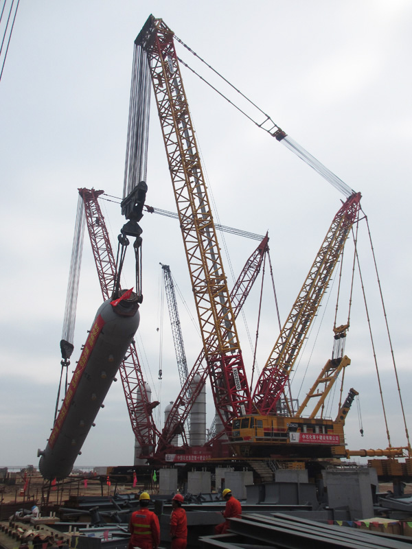 4月1日,徐工XGC28000履带起重机再次进驻中石化泉州炼油基地,吊装设备为蜡油加氢裂化反应器,设备净重达1240.2吨,含吊索具总吊重量达1340吨。