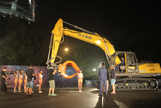 天高气爽的金秋九月,在北京丰台区“吉尼斯中国之夜”的备战现场,金色的徐工XE235C挖掘机在两名徐工员工的轮流操作下,将戴在模特头上的蓝色鸭舌帽一一摘掉,动作干脆利索一气呵成,引发了围观人员的阵阵惊呼。来自徐工挖掘机机械事业部的两位员工吴恒、高芝栋正在拍摄现场进行紧张的彩排,他们即将向“挖掘机一分钟内摘帽子数量”世界吉尼斯记录发起挑战。