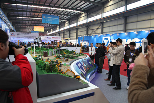 在室内展区,徐工设置了工程机械大型施工工况沙盘、模拟操作系统、大型LED视频播放、触摸屏虚拟展厅、纪念品展示销售、产品施工实景图片、企业风采画廊等展示项目,并设置专业客户接待区及商务洽谈区。