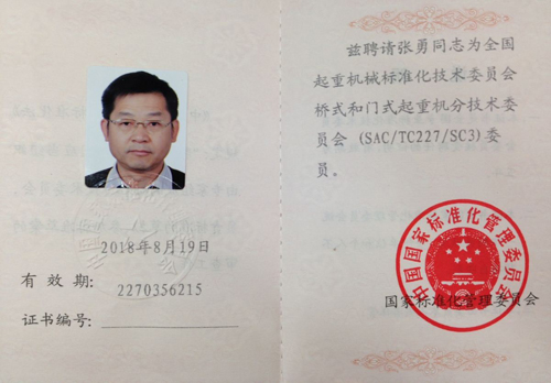 科尼 祝贺张勇先生(Stanley Zhang)连续被聘为全国起重机械标准化技术委员会桥式和门式起重机分技术委员会委员