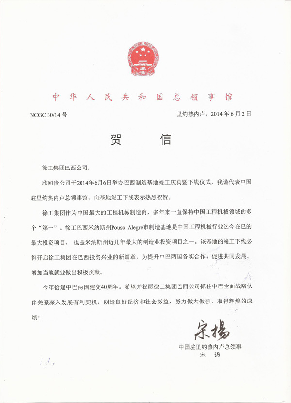 当地时间6月6日,徐工集团首个海外全资生产基地——徐工巴西制造基地竣工投产暨产品下线仪式在巴西米纳斯州包索市隆重举行。巴西工业经济发展部马洛.伯格斯部长, 迪尔玛.罗塞夫总统特使、奥达依.贡雅 议员、米纳斯州经济发展局厚社里奥.内里秘书长,州长特使、包索市阿戈劳多.贝罗叶尼市长、中华人民共和国驻巴西联邦共和国大使馆 王庆元公参、徐工集团副总裁王岩松以及巴西政府及工商界、徐工巴西合作伙伴、在巴中国企业代表、中巴两国媒体、徐工巴西制造有限公司、圣保罗销售公司员工代表等600多人出席仪式,共同见证了这一意义非凡的时刻。