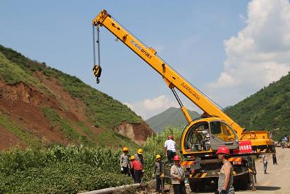 7日,由于受灾地区风雨不断,各处山体滑坡和泥石流等险情更是不断发生,部分地区又出现了断电的情况,为了能让灾区群众尽快恢复用电,云南省抗震救灾指挥部临时调用了一台徐工QY12B.5汽车起重机供电力部门使用。