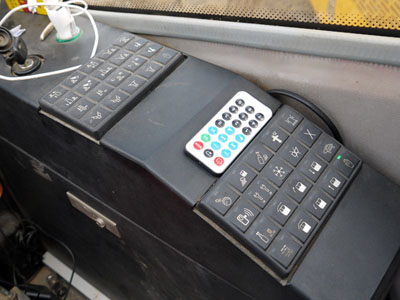 在座椅的右侧有一块控制面板,其上、下各有20个按钮,分别控制超起拉板、拆装车、臂销、悬臂摆动、驾驶室摆动、吊装强制解锁、航空灯、卷扬机构等功能,对于起重机驾驶员来说这些是他们完成起吊工作的好工具,但对于不了解设备的人就会显得难以理解。