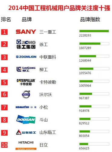 2015年1月20日,中国路面机械网和工程机械电商网在北京发布了《2014中国工程机械用户品牌关注度TOP10排行榜》。这是继2009年中国路面机械网首次推出用户品牌关注度TOP10排行榜以来,连续第六年推出该榜单。