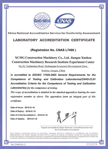 徐工集团工程机械股份有限公司江苏徐州工程机械研究院实验中心(徐工研究院实验中心)通过国家实验室认可,获得了由中国合格评定国家认可委员会(CNAS)颁发的认可证书,徐工研究院实验中心9个实验室146个检测项目获得认可,认可范围涵盖工程机械及相关零部件、汽车及相关零部件、液压元件、环境试验、石油产品、金属材料等6大领域。