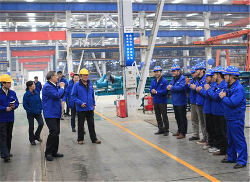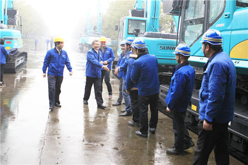 挖掘机生产车间,与制造体系员工亲切握手,并仔细询问了人员到岗、新年生产情况。何老师对随行的挖掘机制造管理人员指出,挖掘机业务作为集团战略性业务板块,必须狠下力气,提升产品质量的前提下,提高整体效率,保证交期,促进销售。