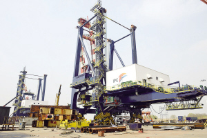 昨天,鼎盛重工两台千吨岸边集装箱起重机在新民洲鼎盛重工码头装船,即将起运印尼。岸边集装箱起重机是为印尼PIP公司丹戎普瑞克码头量身定制的。此岸桥起重机总高度55米,整机重量约1000吨,能吊起50吨重的货物,外伸距可达39米。该产品高效可靠,性能已达到国际先进水平。