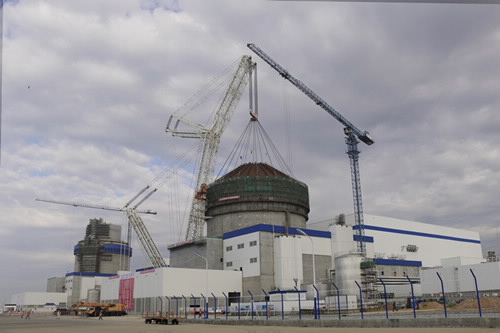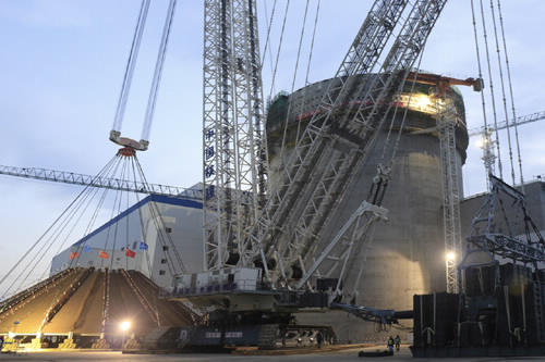 2015年9月12日7点57分,特雷克斯的一台3200吨级CC 8800-1 TWIN履带式起重机经历1小时50分,经过紧张的起吊、旋转、行走、校正、对接等一系列高精度动作,完成了我国首批三代核电AP1000自主化依托项目——山东海阳核电项目二号核岛穹顶的成功吊装。据悉,此次穹顶吊装受力均匀,下口水平度偏差仅109毫米,创下国内穹顶吊装误差值最小记录。