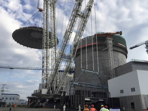 穹顶作为AP1000核岛厂房的房屋顶,和屏蔽墙一起构成了防止安全壳内放射物质发生泄露的保护屏障。此次吊装的穹顶由中核二四公司制作完成,上口直径近13米,下口直径41余米,高近11米,重达800余吨,起吊重量近900吨,呈圆台状,是国内所有核电堆型中尺寸最大、重量最重、结构最为复杂的钢结构。