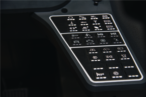 按键区分列清晰,排布有序,小小的区域共融入13项智能化、信息化交互技术,对车辆的安全保护、动作吊装、操纵环境进行控制。相比传统的按键防水性更好,信息覆盖更全面,所有在吊装过程中输入和输出的的信息都被引入系统,增加了操机手对于操作过程的掌控性。