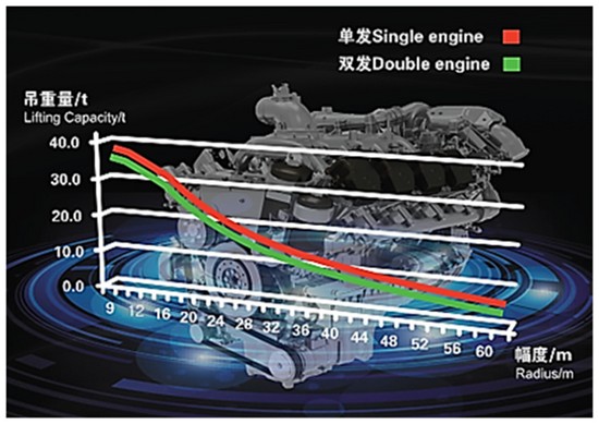 单发动机系统,整车共用一台发动机,即将底盘动力通过传动轴传递至上车,结构简单,可靠性高,故障率更低。XCA450采用G一代单发动机传动技术,整机降重约800kg,节约的重量被合理的分配到吊臂等关键结构件上,作业性能提升5%