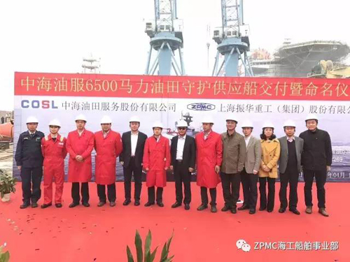 2017年4月11日,上午 9时28分,中海油服6500马力油田守护供应船首制船交付暨命名仪式在长兴基地隆重举行,中海油服公司、上海海事局、中国船级社和振华重工代表共同见证了这一伟大时刻。该船是振华重工与中海油服公司合作的第二个项目6500马力油田守护供应船6艘系列船舶首制船,该首制船舶的成功交付表明振华重工对该系列船型建造的核心技术已全面掌握,同时标志着振华重工与中海油服集团的合作达到了一个新的高度。