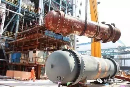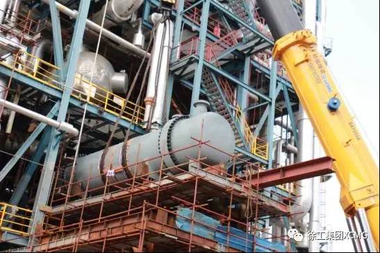 4月4日14时,新22E006换热器在650吨汽车吊强大作用力下,一举吊装成功。