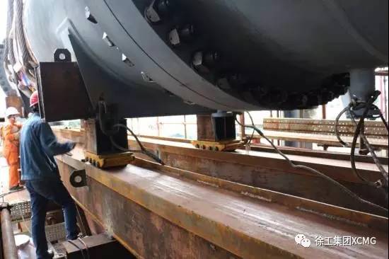 开始移位作业。利用手动葫芦拉力,一毫米、一毫米地将大型设备移出框架轨道外。据现场测算结果显示:4月3日9:30开始移位,至10:30分,1小时移位1.7米,整条换热器重心段移出框架外,约长8米,需6个小时。