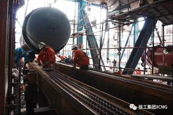 作业人员同心协力,再度把庞然大物——新22E006换热器通过轨道坦克车,接上手动葫芦一点一点移入到预定位置,再进行固定安装。