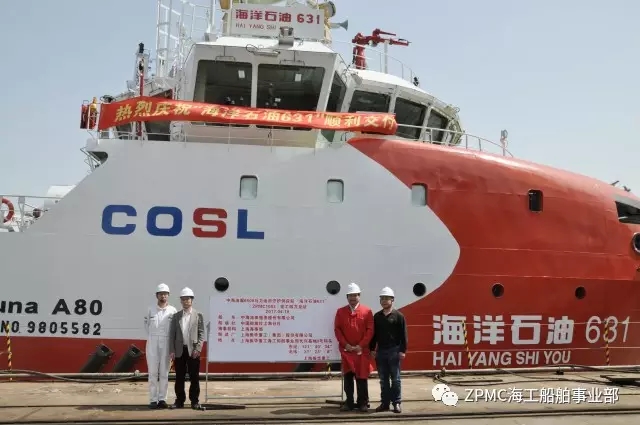 继“海洋石油630”交付7日之后,2017年4月18日,上午 9时28分,中海油服6500马力油田守护供应船2号船---“海洋石油631”交付仪式在长兴基地隆重举行,中海油服公司、上海海事局、中国船级社和振华重工代表共同见证了这一伟大时刻。该船舶的交付是一周之内振华重工向中海油服公司交付的第二艘该系列船舶,表明振华重工对该系列船型建造的核心技术的掌握,同时标志着振华重工与中海油服公司的合作迈向了新的高度。