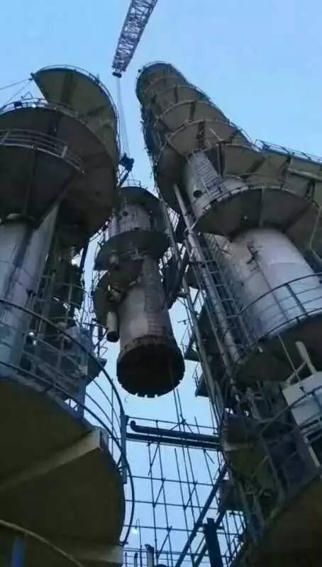 新塔每下降一厘米都必须反复确认,螺栓渐渐穿过新塔裙座的固定孔,新塔就位。