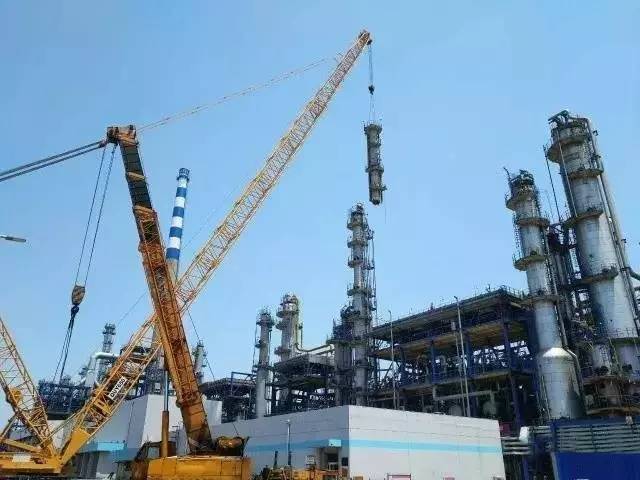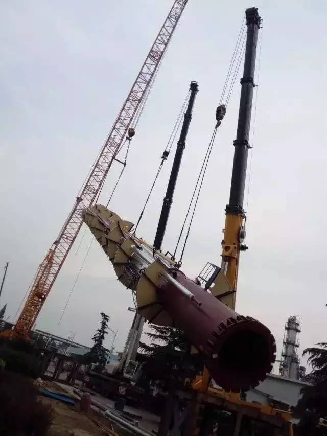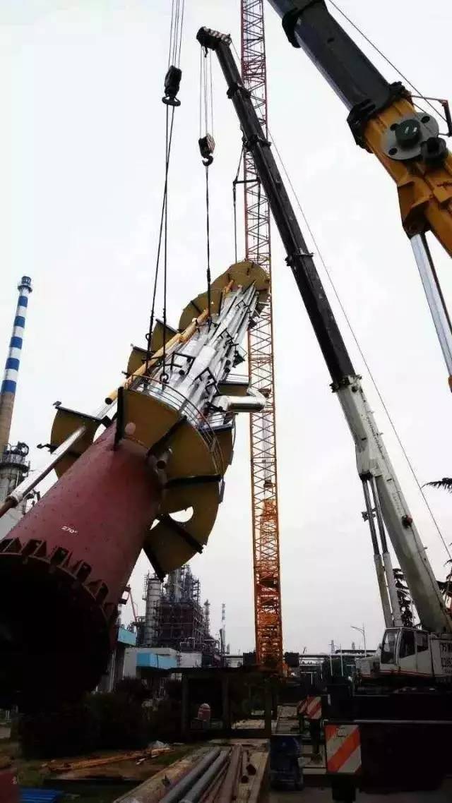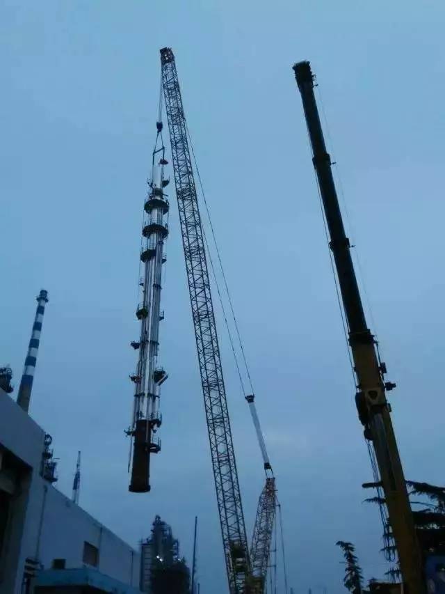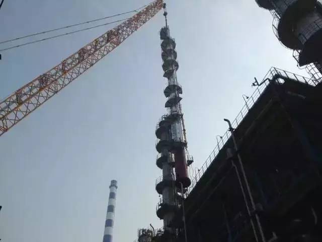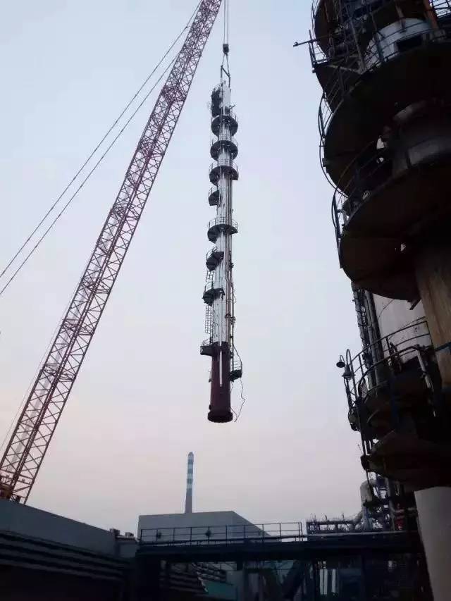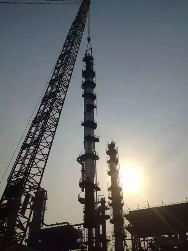 19点左右,新塔已完全直立,托底吊车的吊钩也被卸下,此时夜色降临,吊装人员将塔立于装置外侧,已经提前准备好的预置区,待第二天再进行。