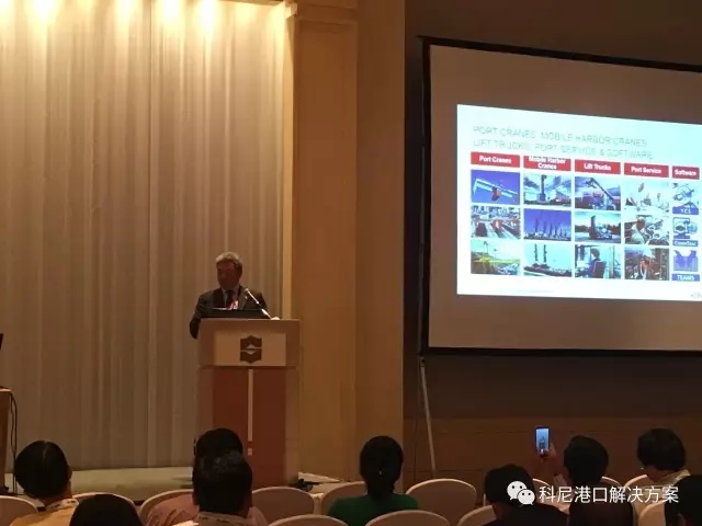 7月7日,科尼港口解决方案销售总监范家麒先生正在向与会代表介绍合并后的科尼港口解决方案及其产品系列。在今年初科尼对于特雷克斯物料搬运设备的收购完成后,Liftace系列叉车,Noell(诺尔)系列起重机以及Gottwald(高华)系列产品已经全部统一为科尼品牌下属不同产品系列。