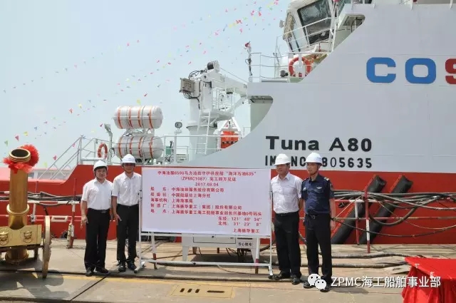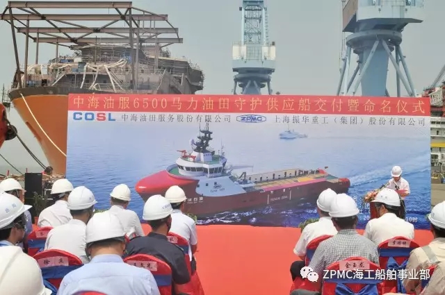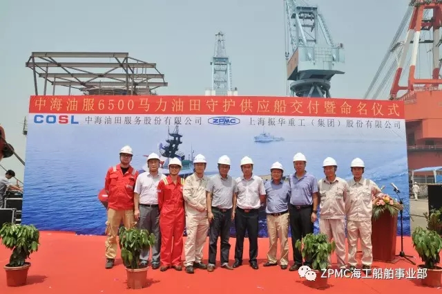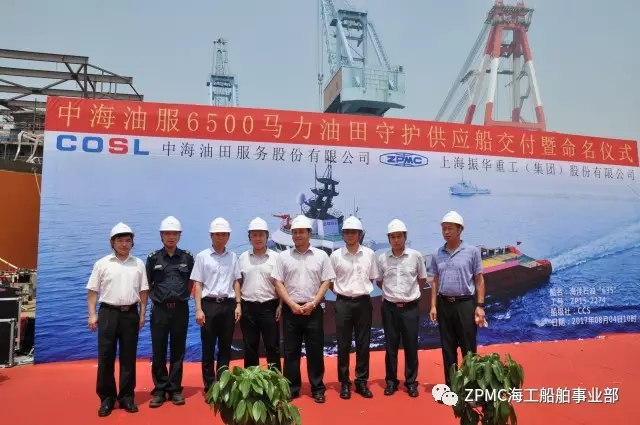 2017年8月4日,上午10时18分,中海油服6500马力油田守护供应船6号船--“海洋石油635”交付仪式在长兴基地隆重举行,上海海事局、中海油服公司、中国船级社、SDARI设计院和振华重工代表共同见证了这一伟大时刻。