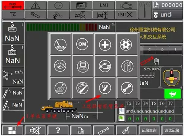 在第一显示器主界面中点击左下角菜单键,在弹出的菜单中选择智能臂架按钮,如图1,在智能臂架界面中右侧有卷扬随动、变幅补偿、工况查询三个按钮用于切换,如图2。