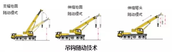 卷扬随动有臂头模式和地面模式两种,臂头模式是指在伸缩(或变幅)过程中卷扬自动收放钢丝绳,使吊钩距臂头的距离保持不变;地面模式是指在伸缩(或变幅)过程中卷扬自动收放钢丝绳,使吊钩距地面的距离保持不变。