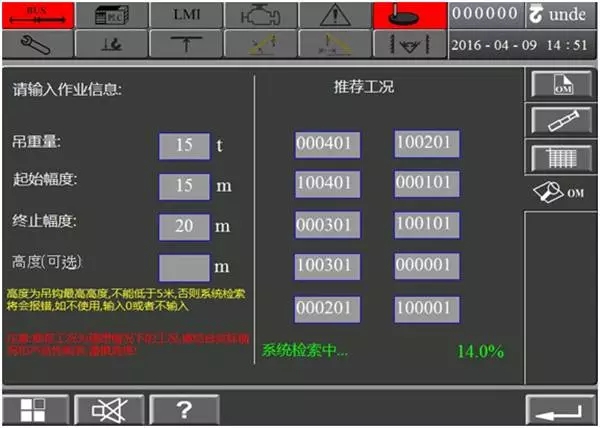 步骤一:根据吊装作业需求,输入作业信息,包括:吊重量、起始幅度、终止幅度以及作业高度(可选,不低于5米);