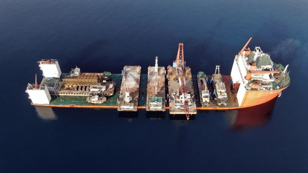 本次运输与浮卸作业难度较大,共浮载了8艘工程船舶,铺满了整个甲板。此次浮卸的6艘工程船,每艘吃水各不相同,且锚地海域常年暗涌较大,适合浮卸的作业窗口期短暂。此外,有两艘工程船超宽,增加了锚地卸货作业的难度。